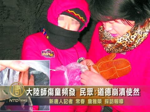 【新唐人2010年12月21日訊】近日大陸媒體接連報導了幾起,孩童在學校或幼稚園,被老師惡意傷害的事件﹔山東即墨市一名教師用火鉤燙傷學生手背﹔江蘇一幼稚園易姓老師用電熨斗燙傷7名孩童臉頰。有民眾認為,缺乏善心、政治體制導致道德底線崩潰,是導致此類事件頻發的原因。