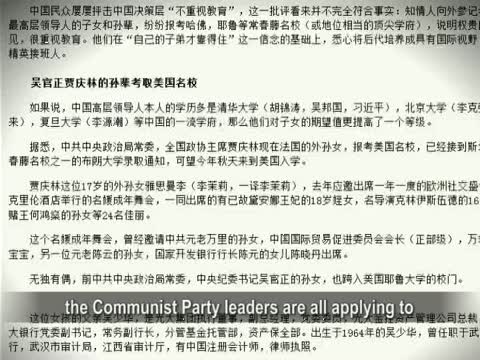 【新唐人2010年12月21日訊】中國的教育經費投入不足,失學兒童眾多,中國民眾屢屢批評中共決策層「不重視教育」;但是,最近網上卻有消息說,中共最高層領導人的後代,爭相進入學費高昂的英美名校。對比中共官二代的求學之路,中國百姓則難以想像!
