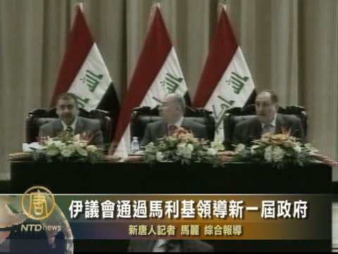 【新唐人2010年12月22日訊】12月21號,伊拉克議會一致通過了馬利基提交的新一屆政府名單,並批准馬利基(Nuri al-Maliki)繼續擔任政府總理。這是自從今年3月份的議會選舉無果而終陷入政治僵局9個月之後,伊拉克在2010年底推出的新一屆政府。