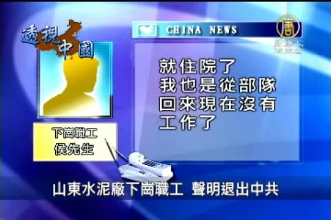【新唐人亞太台2010年12月22日訊】來關心中國新聞真相報導。山東萊州市展潤水泥公司3年前遭沙河鎮政府強行清算,非法侵佔賤賣財產和土地,300個下崗職工沒有獲得合理補償或安置,上訪都被威脅毆打或拘留。兩對下崗職工夫婦共4人,痛恨共產黨貪污腐敗,聲明退出中共。