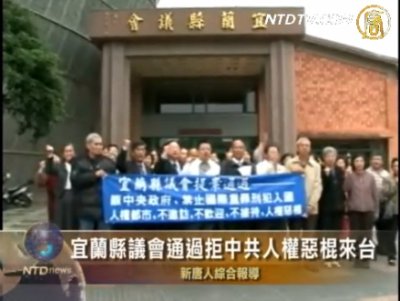 【新唐人2010年12月23日訊】台灣宜蘭縣議會在21號通過提案,要求主管機關詳查來台灣的中共官員及高幹,有沒有涉入嚴重違犯人權情事,如果被發現的話,就不發予入國許可,這項提案在江聰淵等27名宜蘭縣議員的連署下無異議通過,成為了全臺第10個通過這項人權議案的縣市議會。