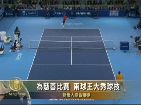 【新唐人2010年12月23日訊】星期三(12月22號),世界網壇的球王級人物納達爾和費德勒,在西班牙馬德里舉行了一場慈善比賽。在現場1萬多名觀眾的助威聲中,兩人大秀球技,讓球迷大飽眼福。