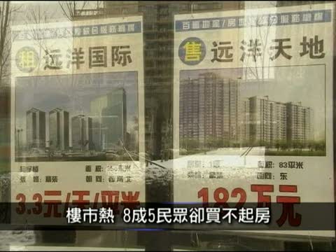 大陸今年全國商品房銷售額將衝到人民幣5.3兆元的歷史新高,不過房市雖熱,調查卻發現,大陸有85%的人買不起房子,一般家庭在普通城鎮,也要不吃不喝8年,才能買第一間房。