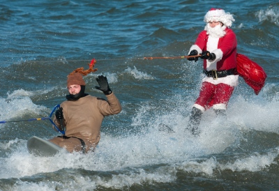 在美國馬里蘭州波託馬克河(Potomac River)的國家港口(National Harbor),聖誕老人換下雪橇,背上禮物袋,登上游艇,乘著滑水板,飛馳在海裡。馴鹿們也大展身手,陪伴在聖誕老人身邊,玩得不亦樂乎。