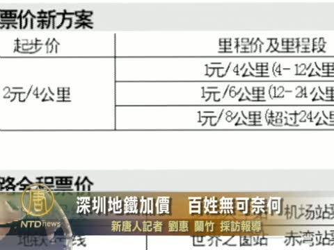 【新唐人2010年12月27日訊】中國廣東深圳,近日發佈了新的地鐵票價方案,採用起步價加里程價的方式。這個方案是票價聽證會上最貴,最不受歡迎的方案,因此民眾相當反彈,指當局綁架民意,並表示,在物價高漲之際還加車費,猶如在民眾“傷口上撒鹽”。