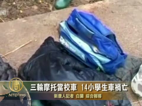【新唐人2010年12月29日訊】湖南衡南縣松江鎮一載有20名小學生的三輪營運摩托,星期一在離學校約500米遠的地方翻入一條小河,導致14名小學生死亡,6名學生受傷。