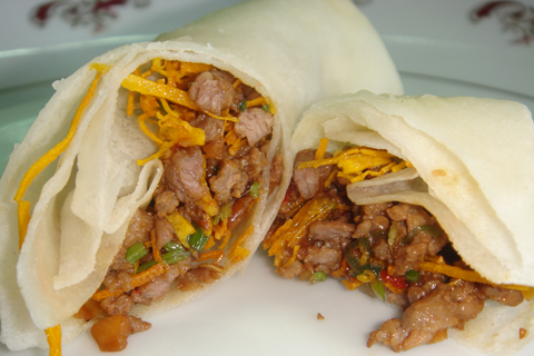11.地瓜絲、牛肉末放在春捲皮上,成圓筒狀即可食用。