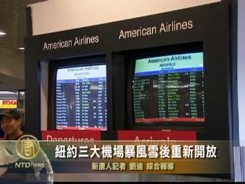 【新唐人2010年12月29日訊】在遭受暴風雪的重創後,紐約三大機場星期二(12月28日)終於重新開放,逐步恢復正常。