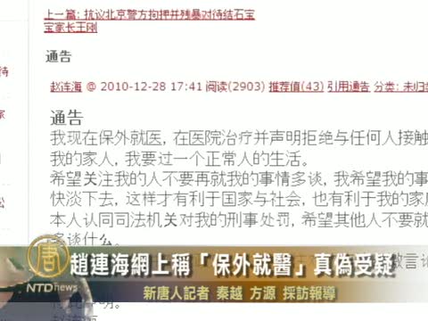 【新唐人2010年12月29日訊】中國結石寶寶之家網站,12月28日下午登載了一篇以趙連海名義發出的通告,稱他已獲保外就醫,並要求外界不要再關注他的事情。通告是否出自趙連海之手,目前受到各界質疑,但外界一致認為,他絕對受到很大壓力。