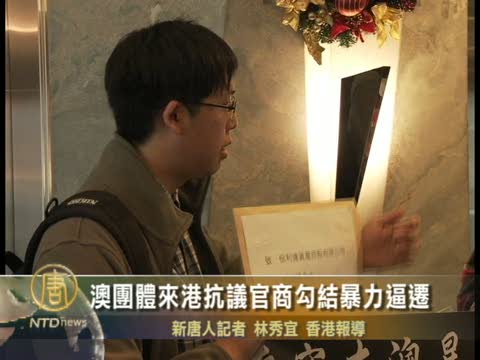 【新唐人2010年12月29日訊】澳門一個民間團體的成員星期二(12月28日)來到香港,抗議總部位於香港的發展商和澳門當局官商勾結,以暴力逼遷木屋區居民,要求立即停止不法行為。