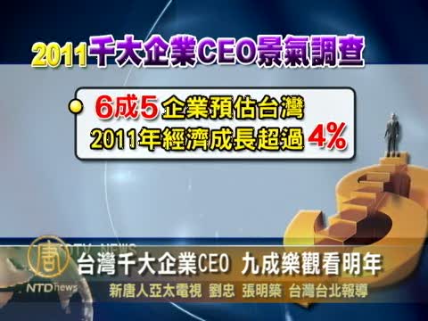 【新唐人2010年12月30日訊】走過金融海嘯、迎向民國百年,2010這一年,台灣的民間投資成長逼近32%,經濟表現出乎意料的好,成長力道能不能維持到2011年?天下雜誌公布對台灣1000大企業CEO的調查結果,有88%的CEO對明年全球景氣感到樂觀﹔有超過七成的CEO認為,匯率與原物料價格將是明年企業面臨的前兩大核心挑戰。
