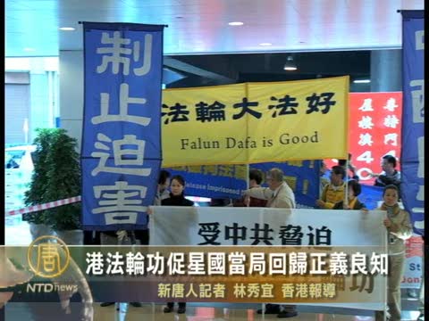 【新唐人2010年12月30日訊】近期多名法輪功學員遭到新加坡政府以莫須有的罪名拘捕及起訴,部分人面臨強迫遣返回中國大陸的危險,引起國際關注。星期三(12月29日),一批香港法輪功學員遊行到新加坡領館抗議,呼籲新國當局回歸正義良知,立即停止配合中共迫害法輪功。