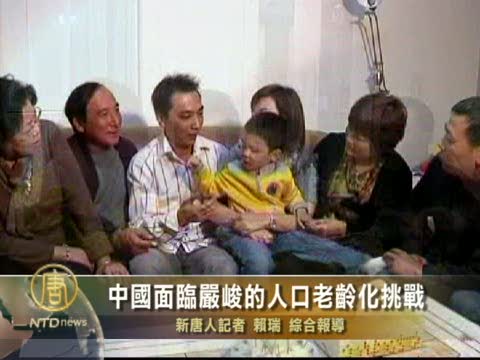 【新唐人2010年12月30日訊】中國一胎化政策即將面臨嚴重後果,第二代獨生子女將要面對一人撫養六個長輩的挑戰。現已進入老齡化社會的中國,即將面臨的是嚴峻的人口老齡化挑戰。