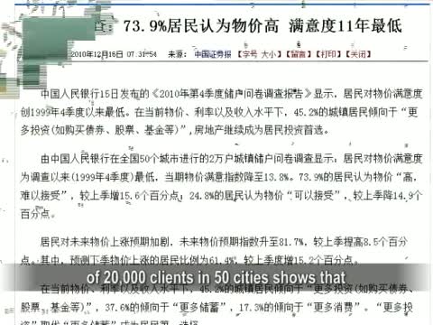 2010年國內食品價格大幅上漲,將11月份的消費物價指數提升到5.1%。央行第四季度對50個城市2萬儲蓄戶調查顯示,73.9%的居民認為物價「高,難以接受」,對物價滿意度創11年來新低。