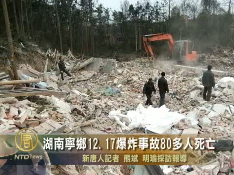 【新唐人2011年1月1日訊】中國湖南寧鄉鐵沖引線廠地坪內一輛裝引線的大車,12月17日晚上九點多發生大爆炸,車上裝有易燃鞭炮引線14000公斤,炸毀附近幾棟樓房,當地民眾透露死亡人數高達80多人。