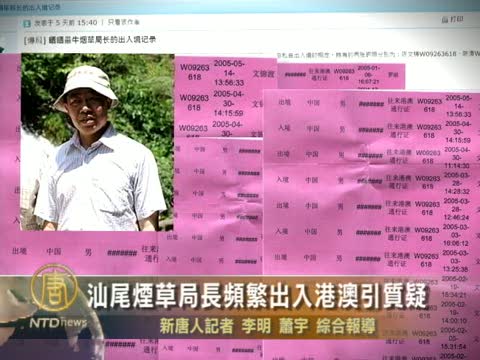 【新唐人2011年1月1日訊】最近中國的網絡上,一篇名為《曬曬最牛煙草局長的出入境記錄》的帖子,相當引人注目,據統計,廣東汕尾市煙草專賣局局長陳文鑄,3年進出港澳多達65次,網民質疑他頻繁前往港澳的動機,要求當局進行調查。