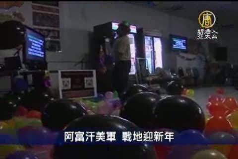 【新唐人亞太台2011年1月1日訊】各地都慶祝迎接2011年,而駐紮在阿富汗的美軍士兵,也用自己的方式,在前線度過了一個難忘的除夕夜。在阿富汗首都喀布爾的一個美軍基地,士兵們特別佈置了大廳,穿上精心準備的服飾,所有人一起唱歌跳舞,互道祝福,共同迎接2011新年的到來。事實上,2010年是阿富汗戰爭局勢最緊張的一年。包括美軍在內的北約部隊,除了積極應付反叛份子的攻擊外,他們也加緊培訓阿富汗當地的軍警部隊,北約部隊預計從2011年7月開始,逐步展開撤軍行動。