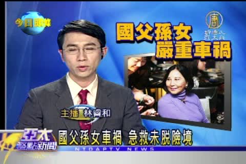 【新唐人亞太台2011年1月1日訊】民國一百年,各地都是歡樂氣氛,不過在元旦這一天卻驚傳國父孫中山的孫女孫穗芬,車禍命危。今天一大早,孫穗芬搭車前往機場,經過建國南路高架橋時、和另一輛轎車、高速對撞,兩輛車、車頭全毀,孫穗芬當時腹腔遭嚴重撞擊,也沒了生命跡象,後來緊急送醫急救,經過八個小時,三個階段的搶救,目前情況相對穩定,送往加護病房觀察,院方表示,孫穗芬的情況並不樂觀,前三天都是危險期,手術後的24小時更是關鍵,如果有最新消息,我們將為您即時插播報導。