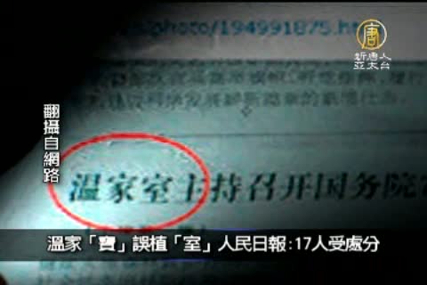 中共喉舌《人民日報》,上月30日在報導的標題中,竟將國務院總理溫家寶的「寶」字誤植成「室」字,名字烏龍寫成「溫家室」。對此一字之差的錯誤,據悉報社已有17人受到處分,當天的負責人也被下令降職。