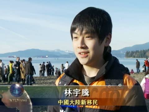 【新唐人2011年1月2日訊】新年的第一天,上千名溫哥華市民不畏寒冷,參加了一年一度的“北極熊冬泳”,用這樣的方式慶祝新年的到來。請看本臺記者從加拿大溫哥華髮來的報導。