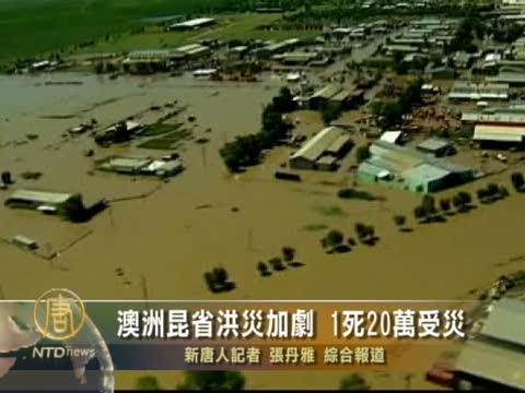 【新唐人2011年1月2日訊】澳大利亞昆士蘭遭大規模的洪水襲擊,星期天洪水繼續迅速蔓延,已造成至少1人死亡,超過20萬人無家可歸,受災城鎮達到20個,面積相當於法國和德國的總和。當局正在加緊疏散災民同時搜尋兩名失蹤人員。