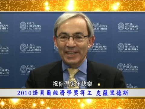 經濟學獎得主之一 克裏斯託弗.皮薩裏德斯 (Christopher A. Pissarides):我叫克裏斯託弗•皮薩裏德斯,今年的諾貝爾經濟獎獲得者。我祝你們兔年快樂,我祝願你們來年幸福快樂。