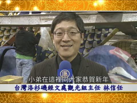 台灣洛杉磯經文處觀光組主任林信任:「新唐人全世界的觀眾朋友,大家新年快樂,小弟在這裡向大家恭賀新年,心想事成、萬事如意。旅行台灣,感動一百。」