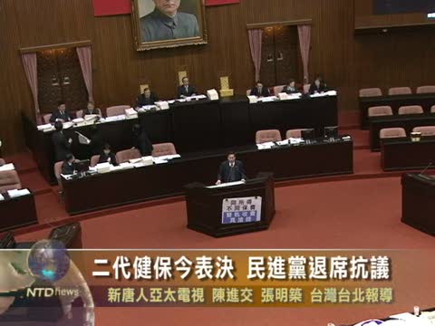 【新唐人2011年1月5日訊】二代健保4號進行三讀表決,由於不滿二代健保修法從家戶總所得退回到個人總所得,民進黨在表決到相關條文時,採取集體退席抗議,議場內只留下立委黃淑英和劉建國與國民黨團針對剩下的爭議條文進行表決。