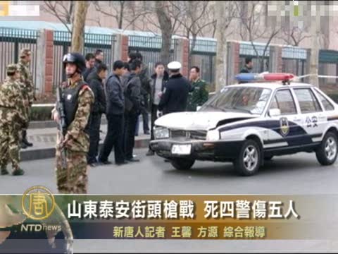 【新唐人2011年1月5日訊】1月4號上午,中國山東省泰安市兩名男子持槍拒捕,與警察發生槍戰,共造成2名民警、1名協警死亡,另外還有4名警察及2位民眾受傷,傷者至少有1人未脫離危險。這兩名男子1人被抓、另外1人開槍自殺。