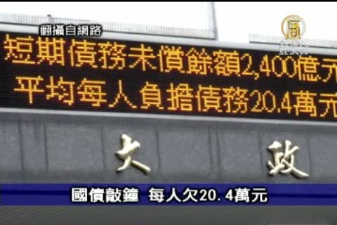 財政部今天在網站及電子看板發布國債訊息,截至去年12月底止,中央政府1年以上債務未償餘額新台幣4兆4735億元,短期債務未償餘額2400億元,平均每人負擔債務20.4萬元。