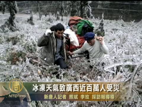 【新唐人2011年1月8日訊】持續多日的冰凍天氣對中國南方地區,湖南、貴州、廣西、重慶等地造成災害,部分地區電力和交通中斷以及飲水困難外,農作物受災嚴重,菜價大漲,廣西目前已近百萬人受災。
