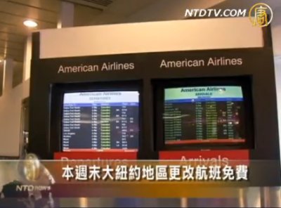 【新唐人2011年1月9日訊】美國航空、聯合航空以及大陸航空公司宣佈,受風雪天氣的影響,在下週一前,搭乘這三家航空公司航班並從大紐約地區紐瓦克、拉瓜迪亞、以及甘迺迪三個主要機場出行或中轉的乘客,可以免費更改航班。通常更改航班的費用為150美元。