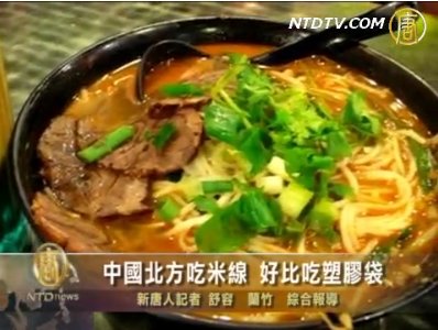【新唐人2011年1月9日訊】中國南方有名的小吃“米線”,近幾年也受到北方民眾喜愛,不過,近期有大陸媒體披露,加工業者在製作米線的過程中,不但加入類似合成塑膠的化工原料,還添加既能增白又能增筋的化學物質,有業者坦白說,吃3碗米線就等於吃下一個塑膠袋。