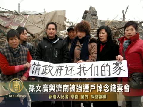 【新唐人2011年1月10日訊】中國浙江樂清市維權村長錢雲會離奇死亡事件,目前非常受到中國民眾關注,尤其一些房子被強拆的民眾;近日,山東濟南一些遭強制拆遷的冤民,就拉起標語,高喊口號,悼念錢雲會。