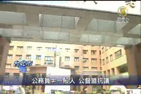 【新唐人亞太台2011年1月10日訊】日前考試院長關中說,「公務人員不等於一般人民」的爭議仍舊餘波盪漾,今天早上公督聯盟到考試院抗議,質疑18%政策拉大社會貧富差距,更是為2012年大選買票。考試院秘書長出面解釋,18%制度是多年的政策,不能影響公務人員與政府的信賴關係。