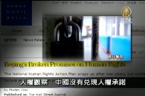 總部設在紐約的「人權觀察組織(Human Rights Watch)」10日表示,中國持續出現刑求、非法拘押、監視和其他侵犯人權的行為,顯示中國並沒有履行他們所提出的第一份人權行動計畫。