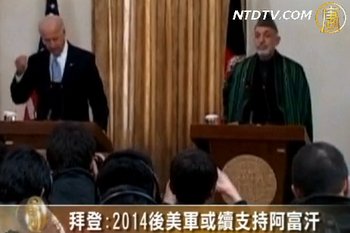 【新唐人2011年1月12日訊】星期二(1月11號),正在阿富汗訪問的美國副總統拜登,在會見阿富汗總統卡爾扎伊時重申,美軍計劃2014年完全撤軍,向阿富汗部隊移交了維護本國安全的能力,但如果阿富汗需要,華盛頓準備繼續提供培訓和援助。