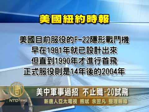 【新唐人2011年1月13日訊】美國國防部長蓋茨證實,中國最新隱形戰鬥機殲-20(J─20)昨天進行試飛,同時印證了蓋茨行前所說的,美國並沒有掌握大陸研發殲-20的進度。美國學者從殲-20試飛前陸續流出的照片研判,這是為中國國家主席胡錦濤下週訪美「造勢」,以壯行色,帶您瀏覽英美重要平面媒體,怎麼看待殲-20隱形戰鬥機的試飛。