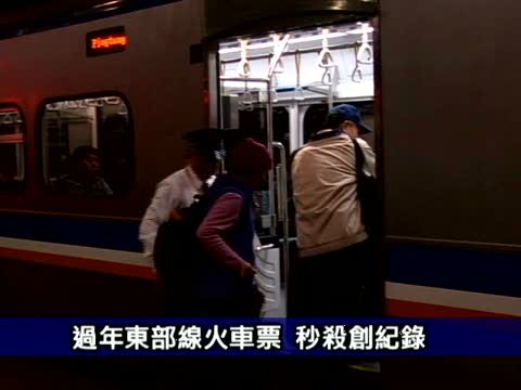 臺鐵今天清晨6時開放過年期間東部幹線火車票預訂,第1分鐘賣出3 萬600多張,創歷年過年訂票記錄﹔臺鐵表示,從15日開始,每天零點30分,將整理公布春節尖峰期間剩餘座位資訊,提供第一時間未訂到車票旅客參考。