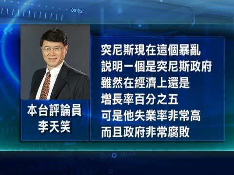 【新唐人2011年1月16日訊】突尼斯獨裁總統本•阿里在大規模民眾抗議下被迫下臺,這一事件引起國際社會的廣泛關注,請看本臺資深評論員李天笑的相關評論。