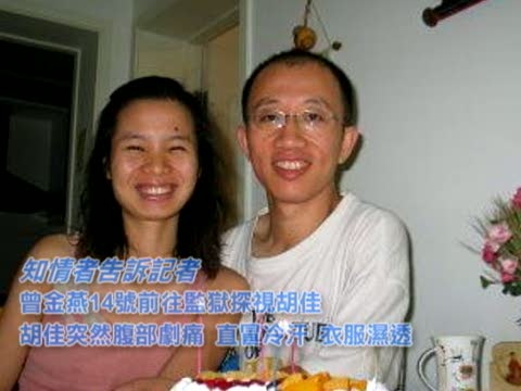 一名知情者告訴本臺記者,曾金燕14號前往監獄探視先生胡佳時,會面不到幾分鐘,胡佳突然腹部劇痛,直冒冷汗,衣服都濕透了。
