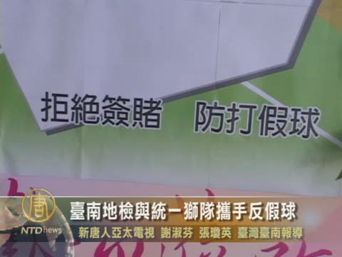 【新唐人2011年1月17日訊】迎接中華職棒22年新球季,臺南地檢署和統一獅隊共同宣誓反假球及反簽賭。臺南地檢說,希望灌輸球員法治觀念,遏止不法的發生。