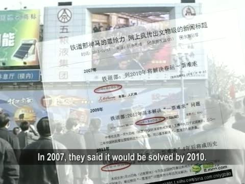 【新唐人2011年1月19日訊】又到了農曆新年返鄉的節日,每年這個時候,“一票難求”成了離鄉在外的遊子搭車的夢魘。1月15號,鐵道部副部長王志國表示,到2015年,一票難求的情況將成為歷史。可是鐵道部的說詞年年相似,年年一票難求。鐵道部被民眾諷刺“滿嘴跑火車”,成為了笑柄。