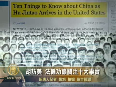 【新唐人2011年1月19日訊】中共領導人胡錦濤目前已經抵達美國訪問。《法輪大法信息中心》藉此時機,提出十點關於中國現狀的事實,呼籲新聞媒體、人權機構、美國公眾、特別是與中共官方會見的美國官員,應該適時給予關注。