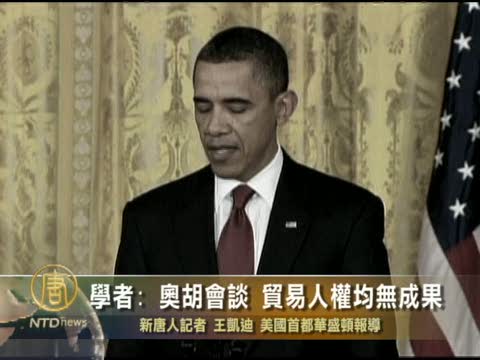 【新唐人2011年1月21日訊】美國總統歐巴馬週三與中共領導人胡錦濤舉行了雙邊會談和聯合記者會,併發表了聯合聲明。針對會談結果,有關專家指出,在普遍關注的貿易、人民幣匯率和人權問題上,會談並無任何實質成果。