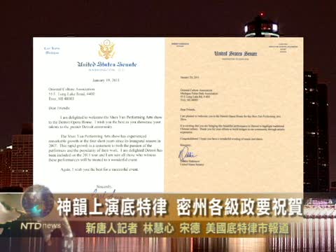 美國聯邦參議員卡爾·萊溫和黛碧·斯泰本納分別發來賀信,祝願美國神韻藝術團的藝術家們向大底特律地區的觀眾展示他們的才華。