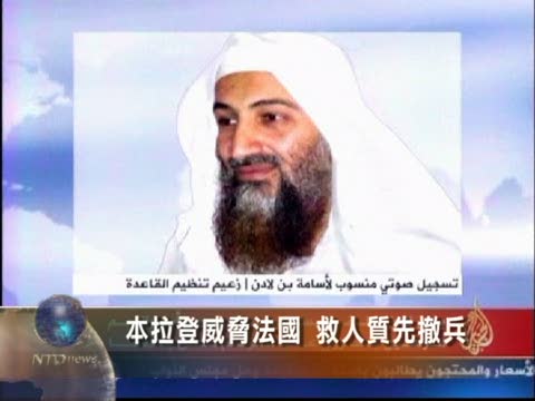 【新唐人2011年1月22日訊】蓋達組織(Al Qaeda)首腦奧沙瑪.本拉登(Osama bin Laden)在星期五(1月21日)最新的談話錄音中表示,在非洲尼日遭綁架的5名法國人質能否獲釋,將取決於法國士兵是否撤離穆斯林的土地。