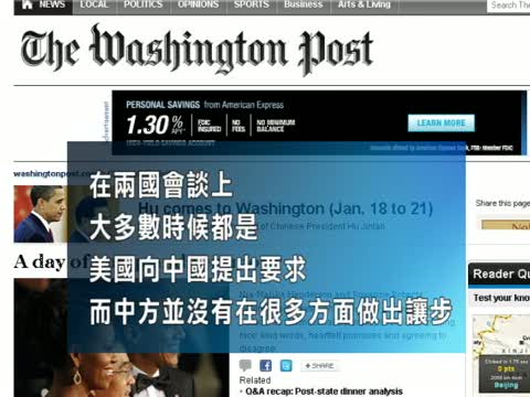 【新唐人2011年1月22日訊】《中美聯合聲明》是這次奧胡峰會的成果,胡錦濤和奧巴馬在經濟、貿易、北朝鮮、人權等方面進行了磋商,但美國媒體普遍認為奧胡這次會晤達成的共識並不多