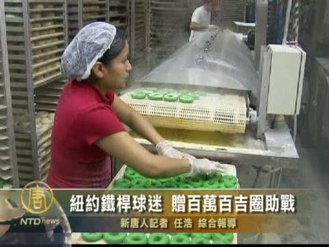 【新唐人2011年1月22日訊】1月21號(星期五),布魯克林的一名鐵桿紐約噴氣機(New York Jets)橄欖球隊的球迷,製作了一百萬個綠色百吉圈麵包,免費送給球迷,來支持紐約噴氣機隊在週日的比賽。