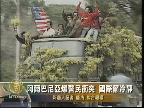 【新唐人2011年1月22日訊】位於南歐巴爾幹半島的阿爾巴尼亞,星期五(1月21日)發生大規模警民衝突事件,造成至少3人死亡,50人受傷。這場衝突起源於反對黨抵制前年的選舉結果,要求提前舉行大選,並批評執政黨濫權與腐敗。國際社會則呼籲阿爾巴尼亞內部冷靜,並儘快地化解衝突。